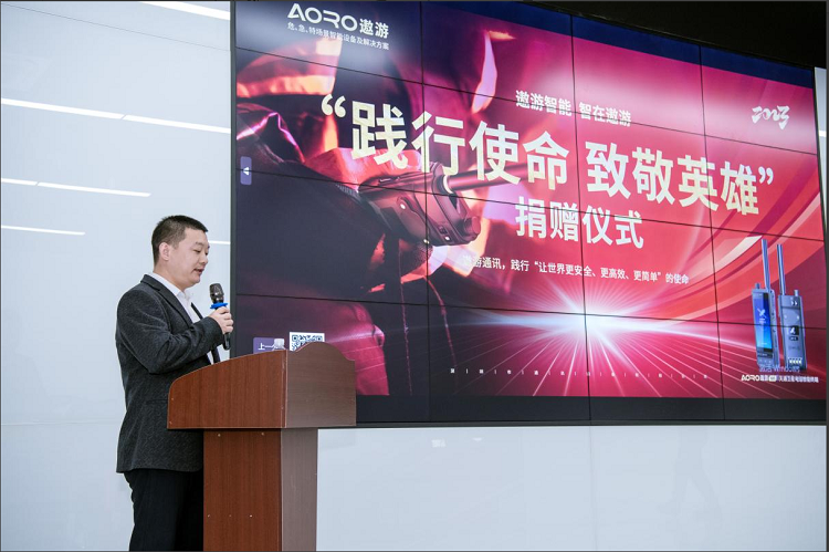 “宝剑赠英雄!深圳公益救援队一直以来都是救援行动中的中流砥柱,今天,我怀着无比激动的心情,代表遨游通讯,捐赠天通卫星电话,向一线救援的英雄们——深圳公益救援队,表达我们深深的敬意!让我们携手共进,为践行‘让世界更安全、更高效、更简单’的使命,共同奋斗。”