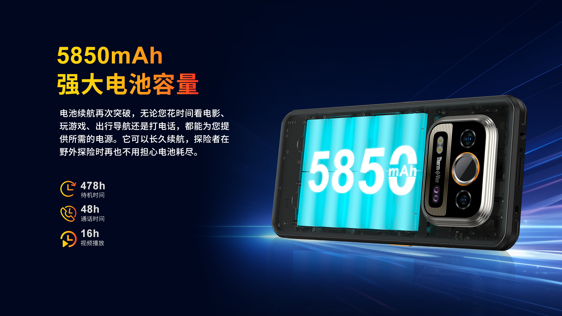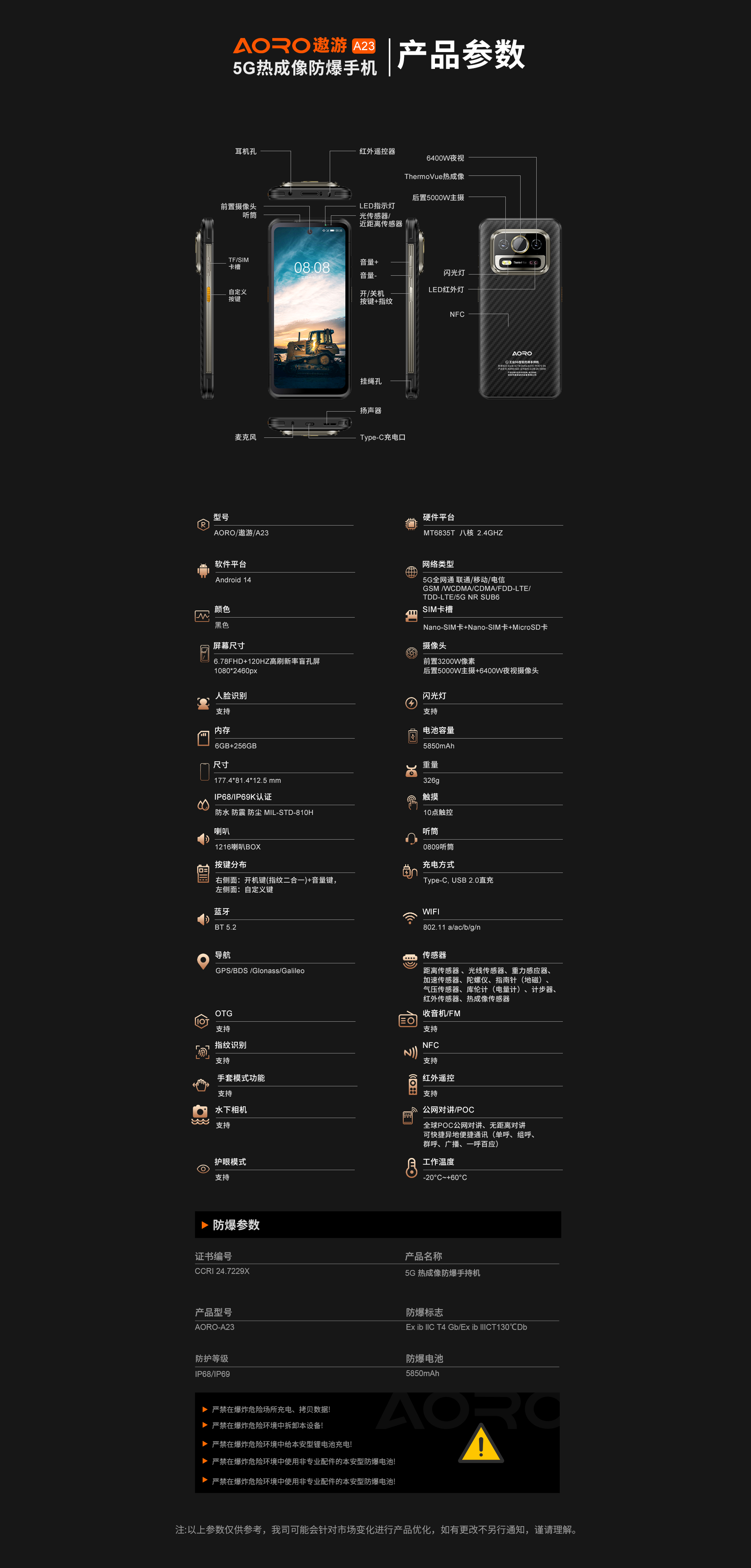 POC公网对讲 | 5G全网通|电信5G|移动5G|联通5G | 双卡双待 | Android 14系统 | 屏幕英寸 6.78 FHD+ 1080*2460 康宁大猩猩屏幕 | MT6835T 八核 2.4GH | 机身内存 6GB RAM+256GB ROM | 聚合物锂离子电池5850mAh 超长待机 | 前置3200万 后置5000W主摄+6400W夜视摄像头+ThermoVue热成像 | IP68/IP69K防水|防震|防尘 | NFC | OTG功能 | 四模定位导航 | 红外遥控 | 无线充30W、有线快充33W