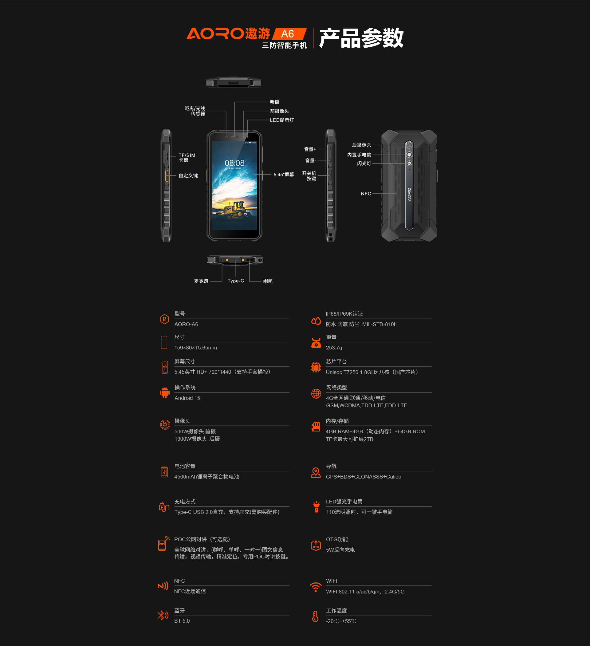 AORO遨游A6三防智能手机 | POC公网对讲 |4G全网通 移动、联通、电信4G | 双卡双待 | Android 15系统 | 屏幕英寸 5.45 HD 720*1440 | 国产芯片Unisoc T7250 1.8GHz 八核 | 机身内存 4GB RAM+(4GB动态内存RAM)+64GB ROM | 扩展内存支持(2TB) | 4500mAh电池 超续航 长待机 | 前置500万 后置1300万 | IP-68/IP69K防水|防震|防尘 | 可一键拍照/录像 | 手套模式操作 | 内置超光手电筒 | NFC近场通信 | OTG功能(5W OTG反向充电)四模定位导航GPS+BDS+GLONASS+GELILEO