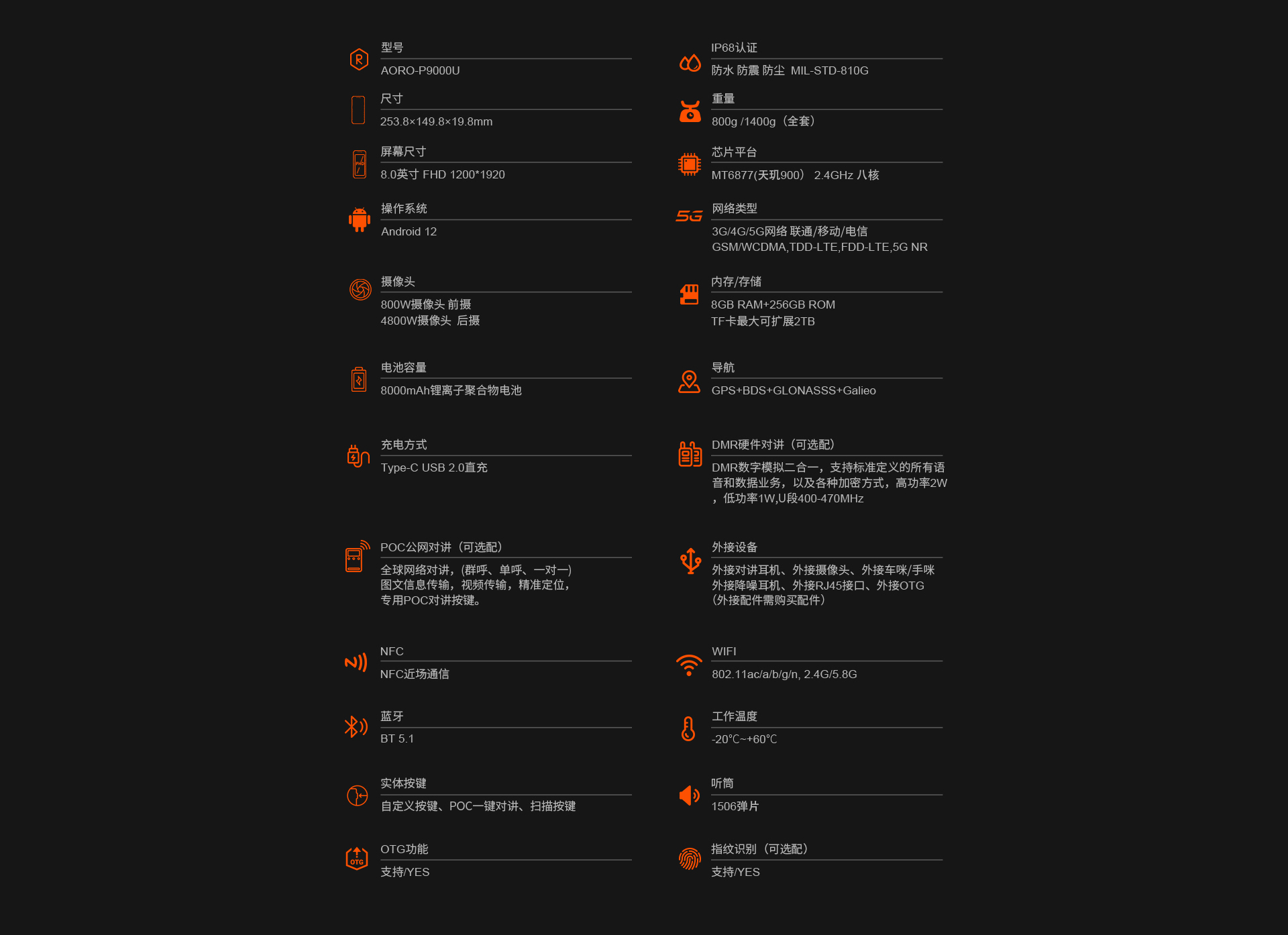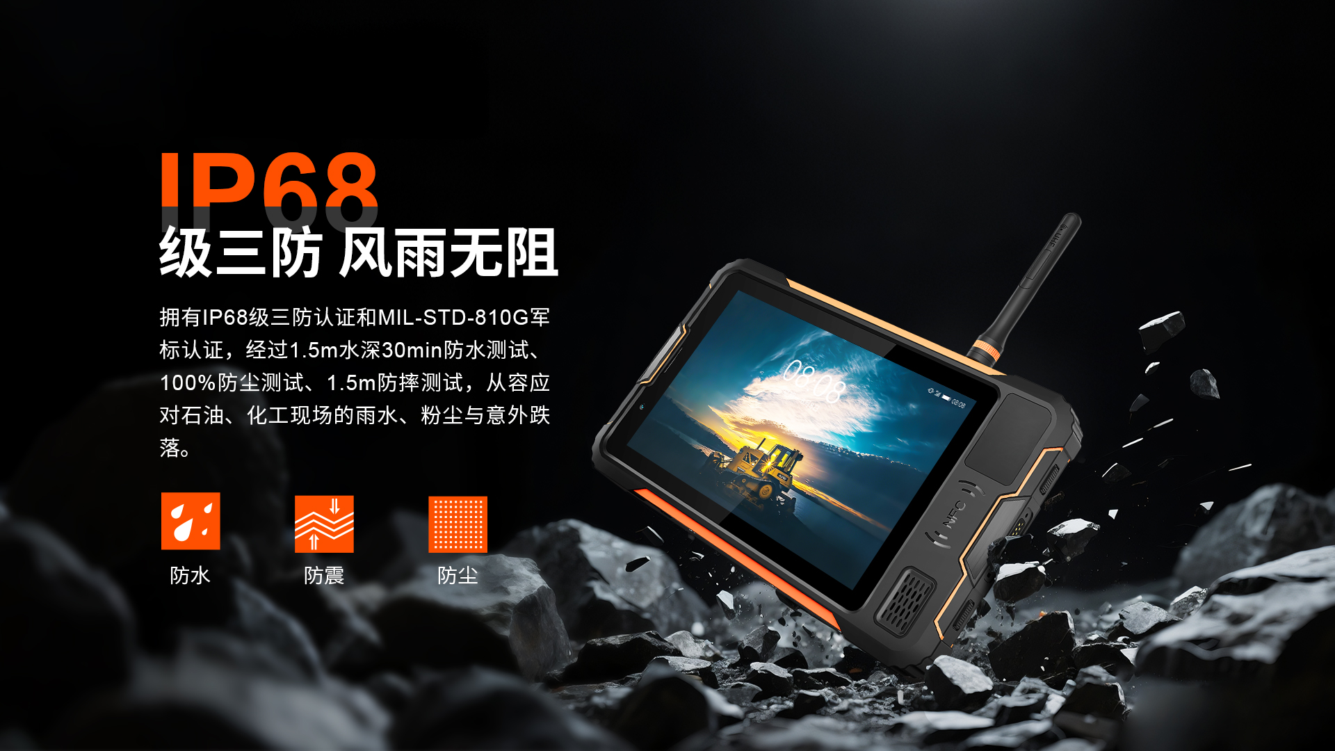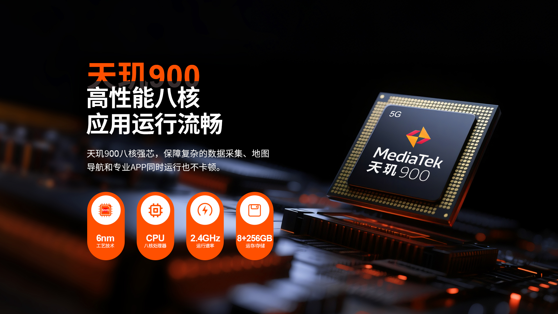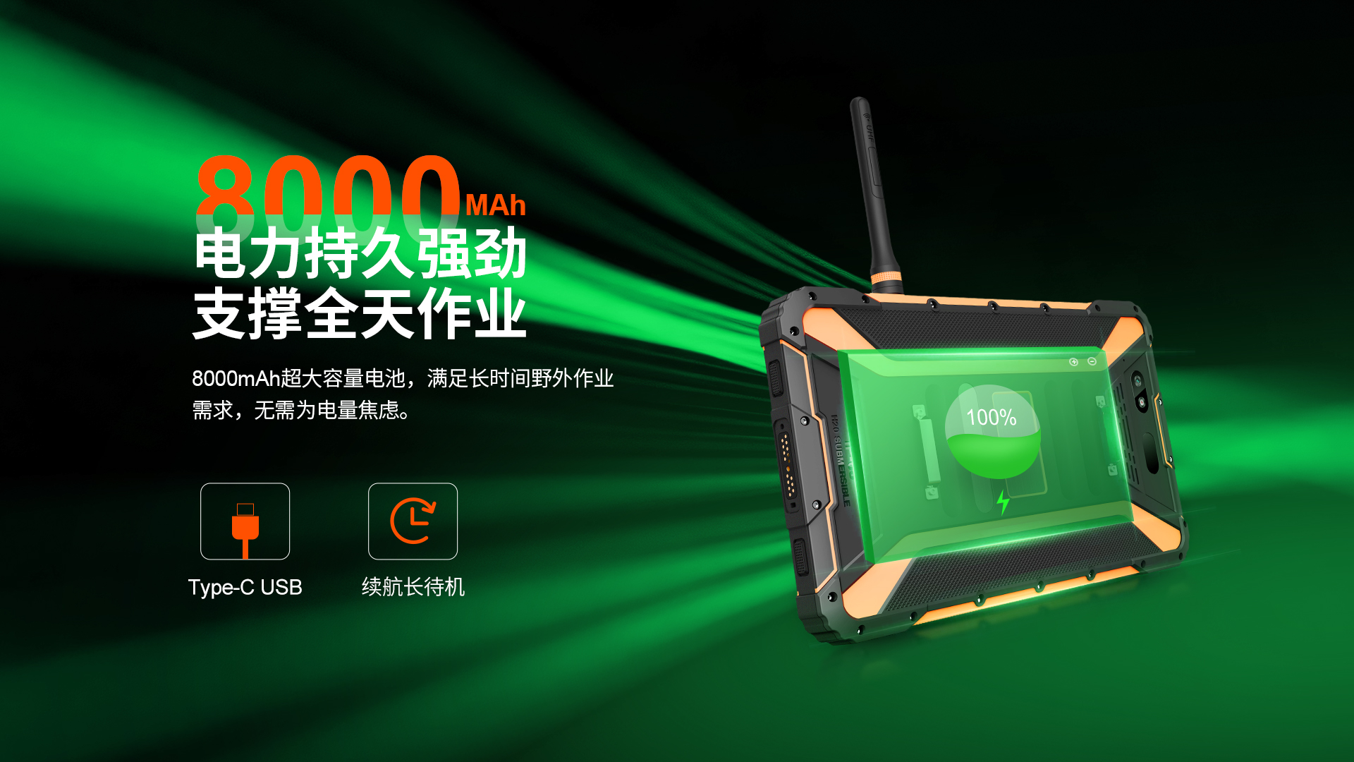 数据采集多模融合通讯智能终端 | 5G全网通 | 双卡双待 | Android 12系统 | 屏幕英寸 8英寸 FHD 1200*1920 | MT6877(天玑900) 2.4GHz 八核 | 机身内存 8GB RAM+256GB ROM | 聚合物锂离子电池8000mAh 超长待机 | 前置800万 后置4800万 | IP68防水|防震|防尘认证 | NFC | OTG功能 | DMR窄带对讲、POC公网对讲、PDT集群对讲、单北斗、2D扫描头、RTK高精度定位、天通卫星电话、北斗短报文(多功能可选配)