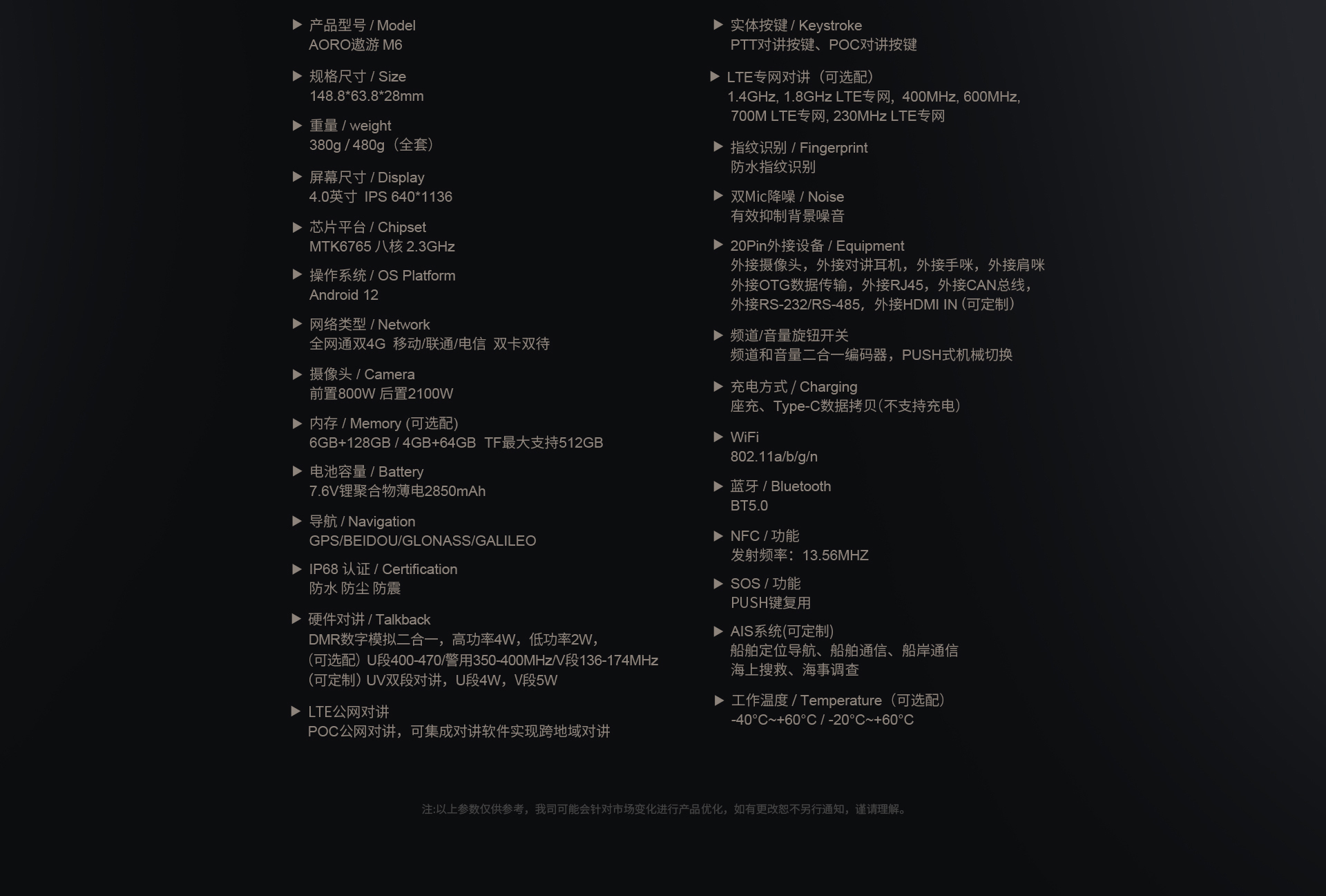 4W DMR数字模拟对讲 二合一 双时隙 | DMR+POC双对讲键 | 4G全网通|电信4G|移动4G|联通4G|3G|2G | 双卡双待 | Android 12系统 | 屏幕英寸 4.0 IPS高清硬屏 640*1136 | MT6765 2.3GHz 八核 机身内存 6GB RAM+128GB ROM | 扩展内存支持(512G) 超长待机 | 7.6V锂聚合物薄电2850mAh | 前置800万 后置2100万 | IP-68防水|防震|防尘认证 1.2米水下浸泡30分钟 1.5米跌落 | NFC近场通信技术 OTG功能 | 防水指纹识别 | 双Mic降噪设计 | 大喇叭 | 充电方式 座充 | 工作温度:-20℃~+60℃ / -40℃~+60℃(可定制)
