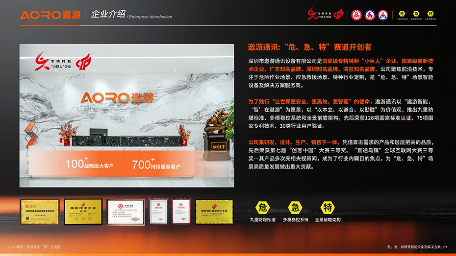 遨游是同行业领域的专网通信解决方案以及设备提供商,致力于警用和公共安全、商业安全、交通安全、公共事业等用户,提供恰如所需的专网通信产品、服务以及通信解决方案,提高各个行业的应急通信与指挥调度能力,为各行业用户处理一切事情提供便捷。公司不断的追求科技创新,持续每年投入大量的资金投入新产品的研发。现如今产品类型有三防智能对讲手机、三防平板、中继台设备、POC等一整套的解决方案。公司以解决用户问题,方便用户为理念,所以,我们可以根据用户需求,定制出适合客户特殊行业的产品。